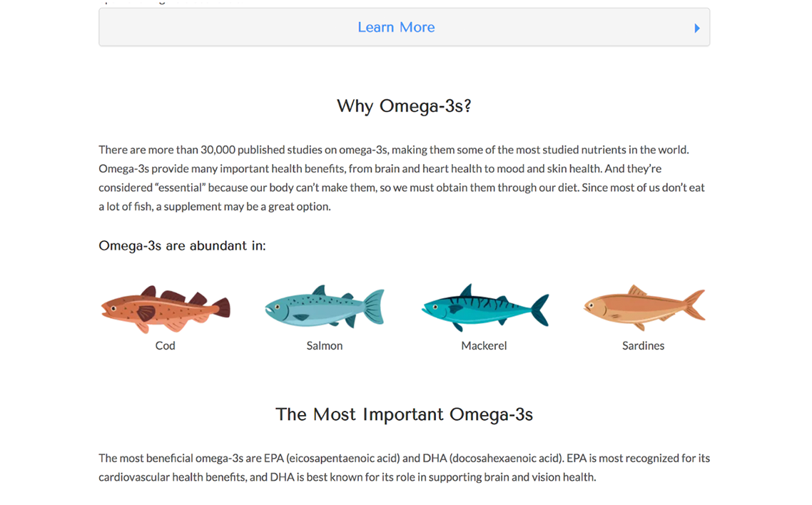 乍一看,您會發(fā)現(xiàn)首頁的設計精巧,其中包含一些營養(yǎng)補品的吸引人的拼貼畫。主頁還包括放大的文字和一個簡短的視頻,上面寫著“卡爾森Omega-3區(qū)別”。單擊視頻后,您會注意到該視頻附帶摘要文本和YouTube隱藏字幕。
