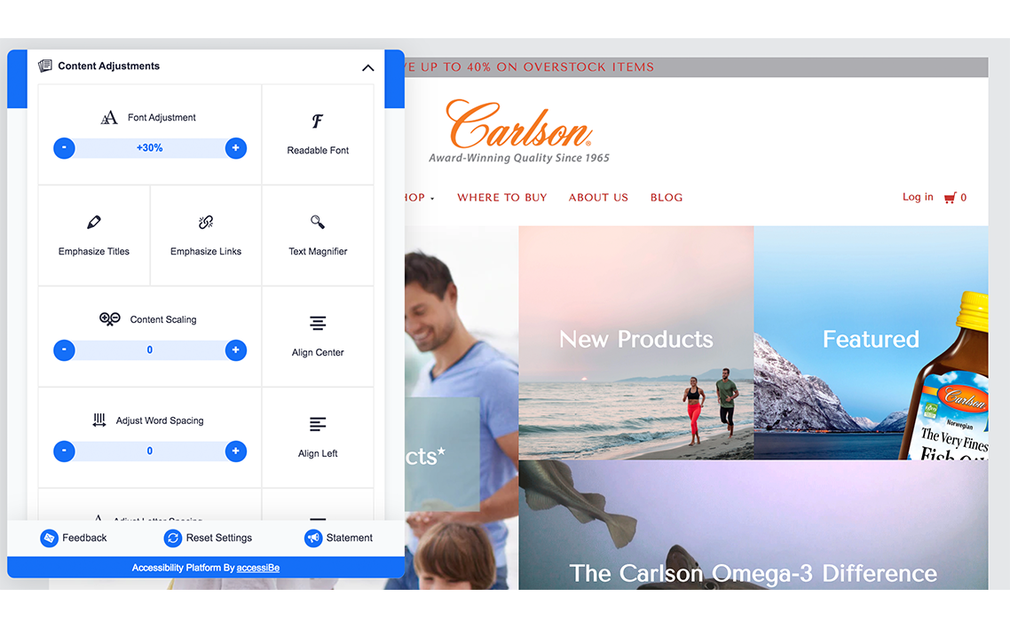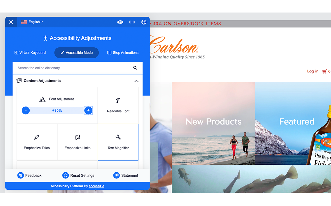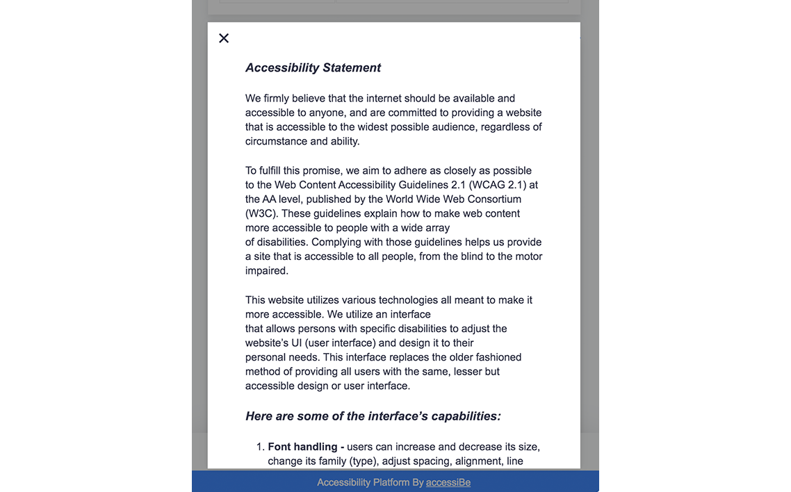 當用戶單擊該圖標時,它們將被定向到一個藍色框,顯示為“輔助功能調整”。Accessibility Platform由accessiBe驅動,使用戶有機會修改或更改文本和字體的大小,以便于閱讀和閱讀。易于導航: