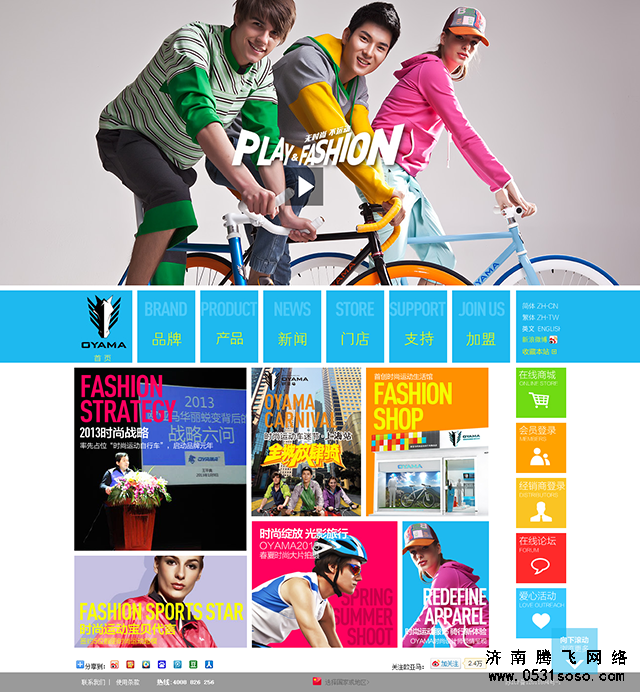 1、第一個案例是濟南騰飛網絡為OYAMA定制的官方網站。從首屏設計上就不難看出網站需要表現出一種積極向上,充滿朝氣的氛圍。因此設計師很巧妙的將人物元素融入METRO的設計風格,這樣既能避免色彩多造成的視覺疲勞,也能順勢利用豐富亮麗的色彩,讓網站看起來更加生動有活力。