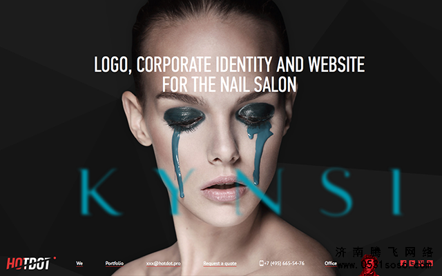 3、HotDot的網站背景風格似乎很符合現代設計師的口味。背景中的人物使用亮點不僅僅只在于獨特搶眼的妝容上,更在于人物的視線方向上。從整個網站的布局上來看,用戶體 驗并不是很理想,導航在首屏的底部,而且字體和顏色也很不利于閱讀。所以,設計師利用人物的視線,將用戶的視線帶到了底部導航部分,很大程度的彌補了這一不足。