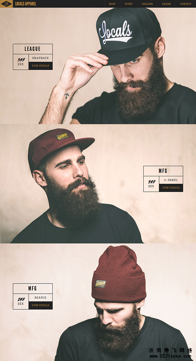 9、LOCALS APPAREL的網站前三屏都使用了人物背景,這三張圖片中人物所表現出的形態都不盡相同,但展現出的效果卻很類似。這個網頁背景是一個很典型的用畫面中的人物來引導用戶的案例,設計師利用同一個人物的不同方向,讓整體變得既統一又清晰。